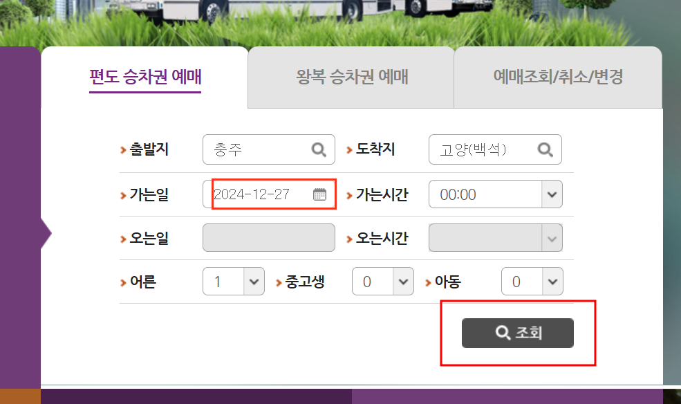 - 출발지와 도착지, 출발 날짜를 선택한 뒤 "조회하기" 버튼을 누릅니다