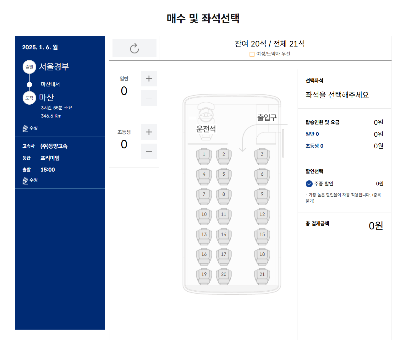 - 좌석 선택: 시간표를 확인한 후 인원수와 선호 좌석을 선택하세요.
