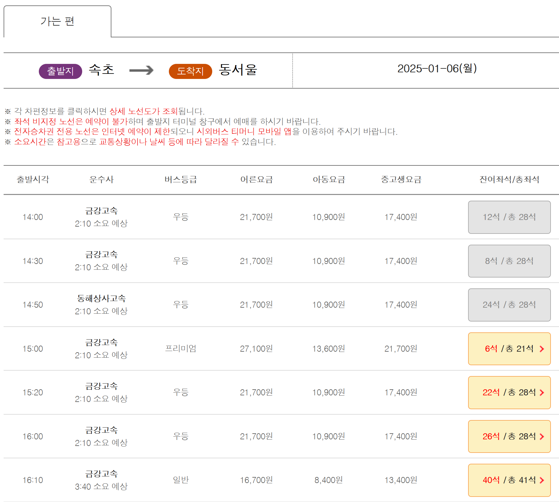속초시외버스터미널 시간표를 빠르고 정확하게 확인하고 싶으신가요? 이 페이지에서는 2025년 1월 기준 업데이트된 속초시외버스터미널 시간표와 이용 팁을 안내합니다. 모든 정보는 신뢰할 수 있는 공식 예매 사이트를 참고하여 제공됩니다.
