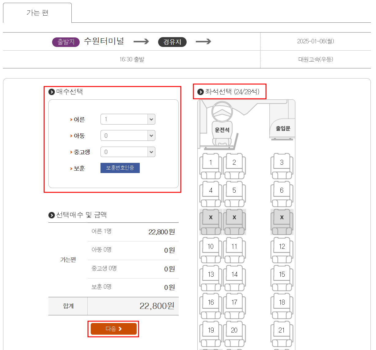 - 정보 입력: 출발지, 목적지, 날짜, 시간 등을 선택합니다.