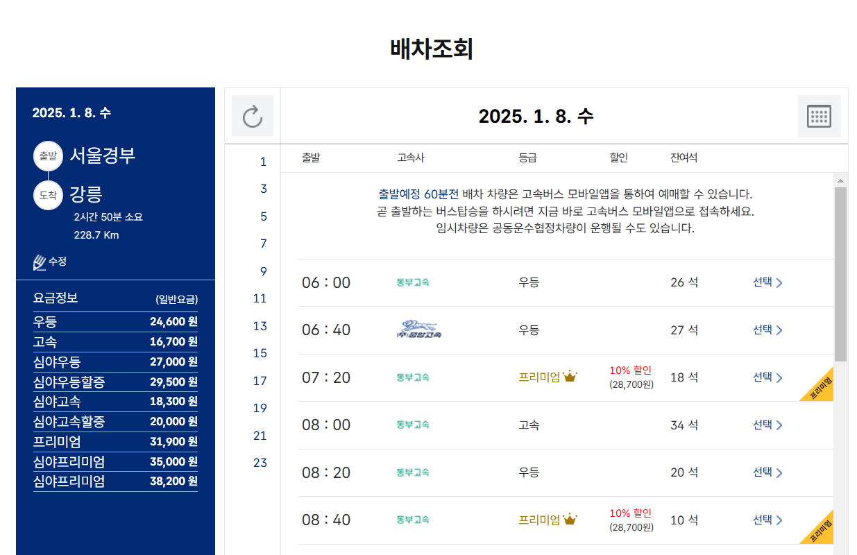 조회 결과가 나오면 배차 시간, 잔여 좌석, 버스 등급 등을 확인하고 적합한 버스를 선택합니다. 예매를 원하는 버스를 선택한 후 아래 절차를 따릅니다.