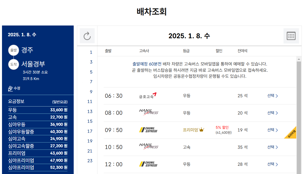 - 출발 직전 좌석 상황에 따라 유동적으로 예약