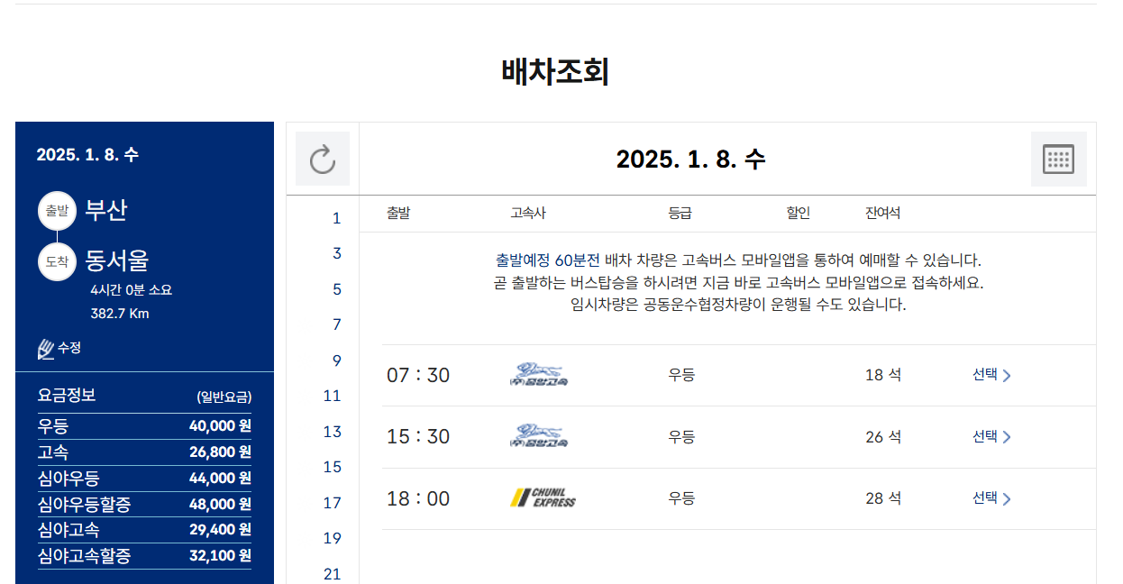 고속버스 시간표와 실시간 좌석 현황은 공식 웹사이트에서 확인할 수 있습니다.