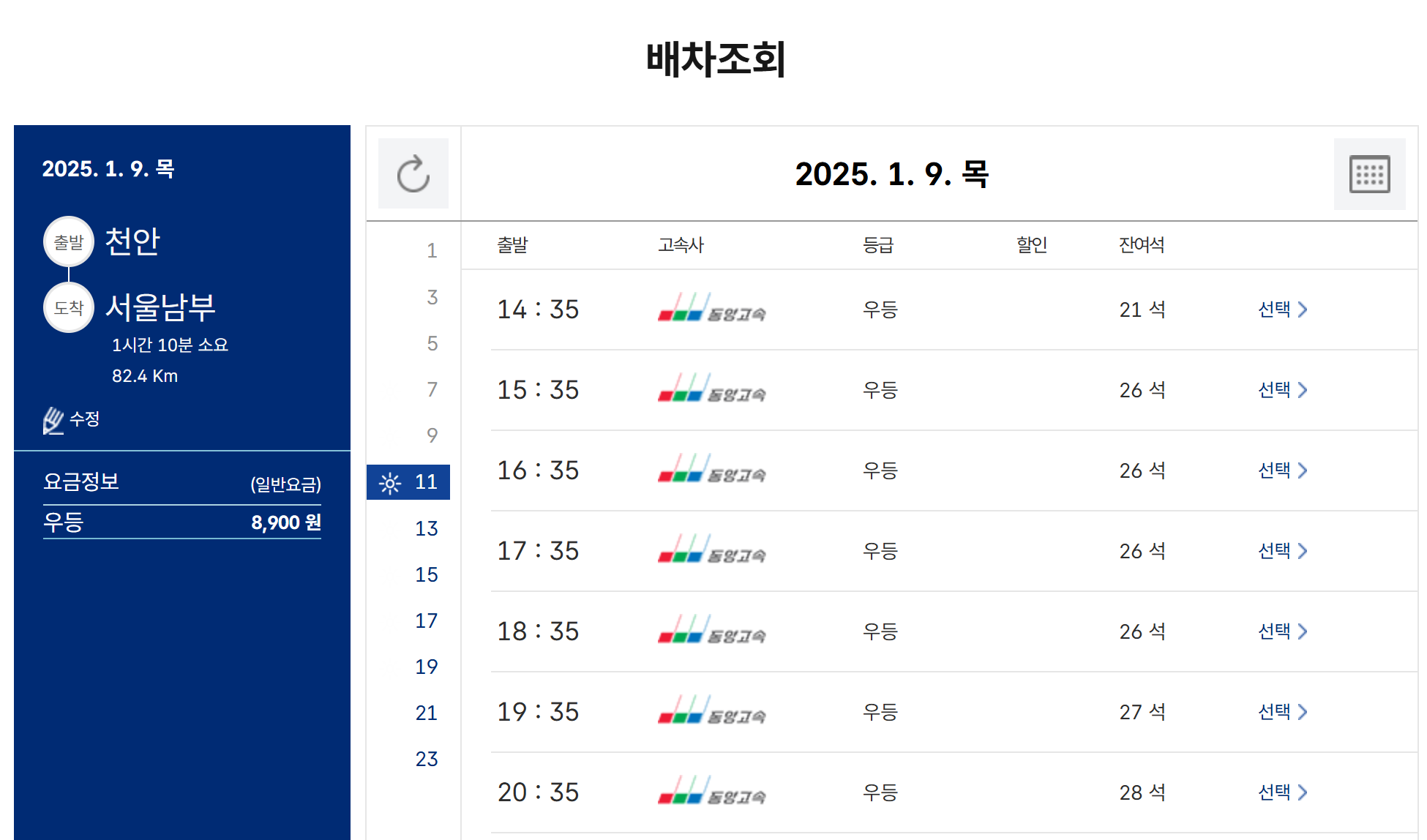 - 소요 시간, 요금, 잔여 좌석 등을 확인한 후 원하는 시간대를 선택하여 결제하면 예매 완료!