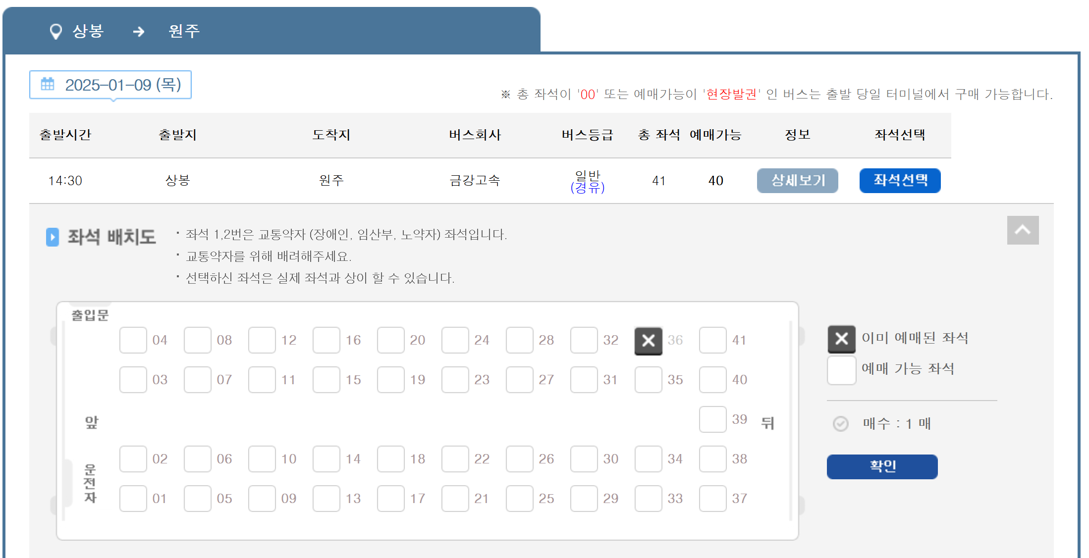 - 예매 사이트에 접속하여 출발지, 도착지, 날짜, 시간 등을 입력 후 좌석 선택과 결제를 진행합니다.