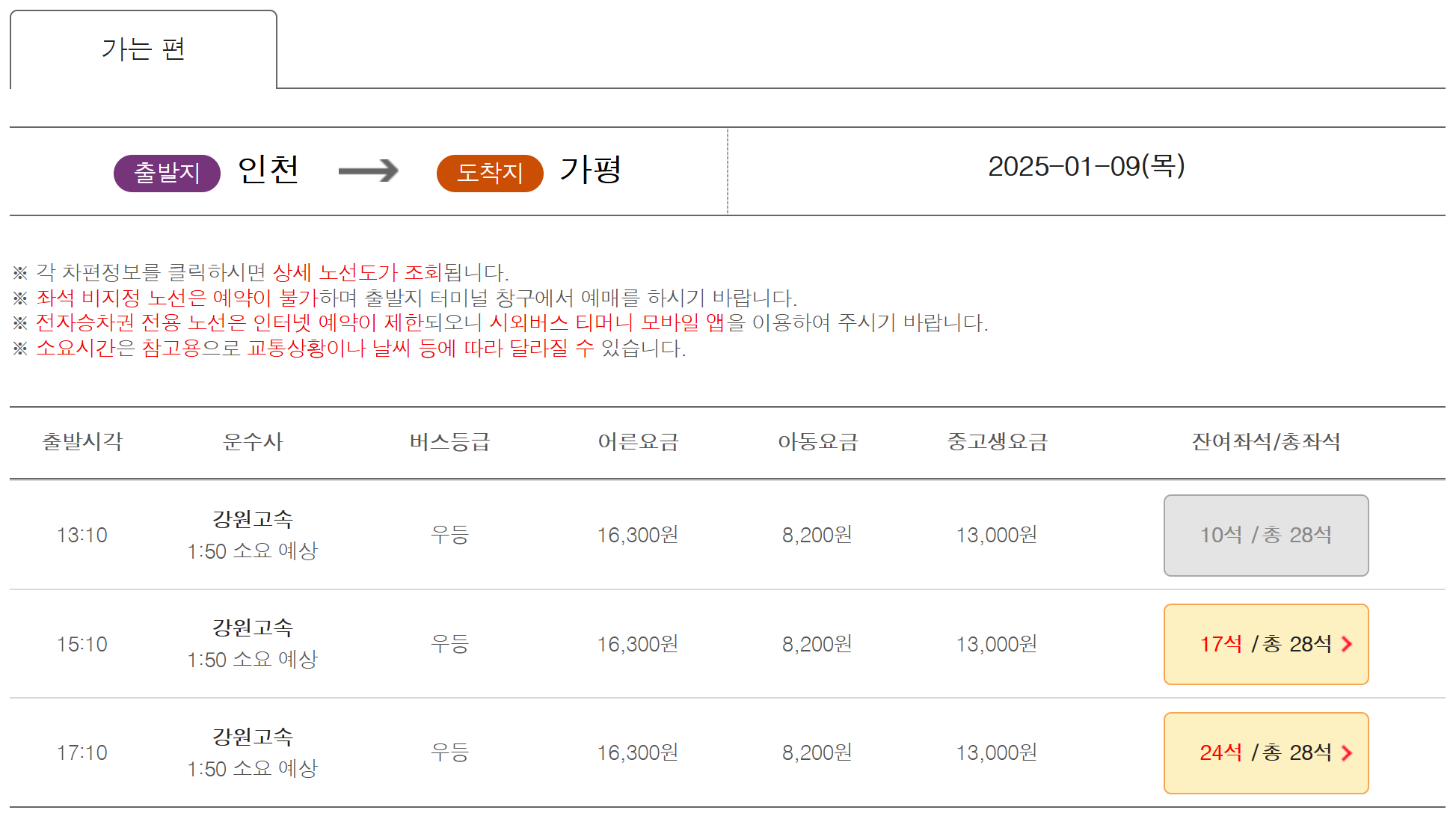 - 출발지와 목적지 입력 (예: 인천 → 춘천).