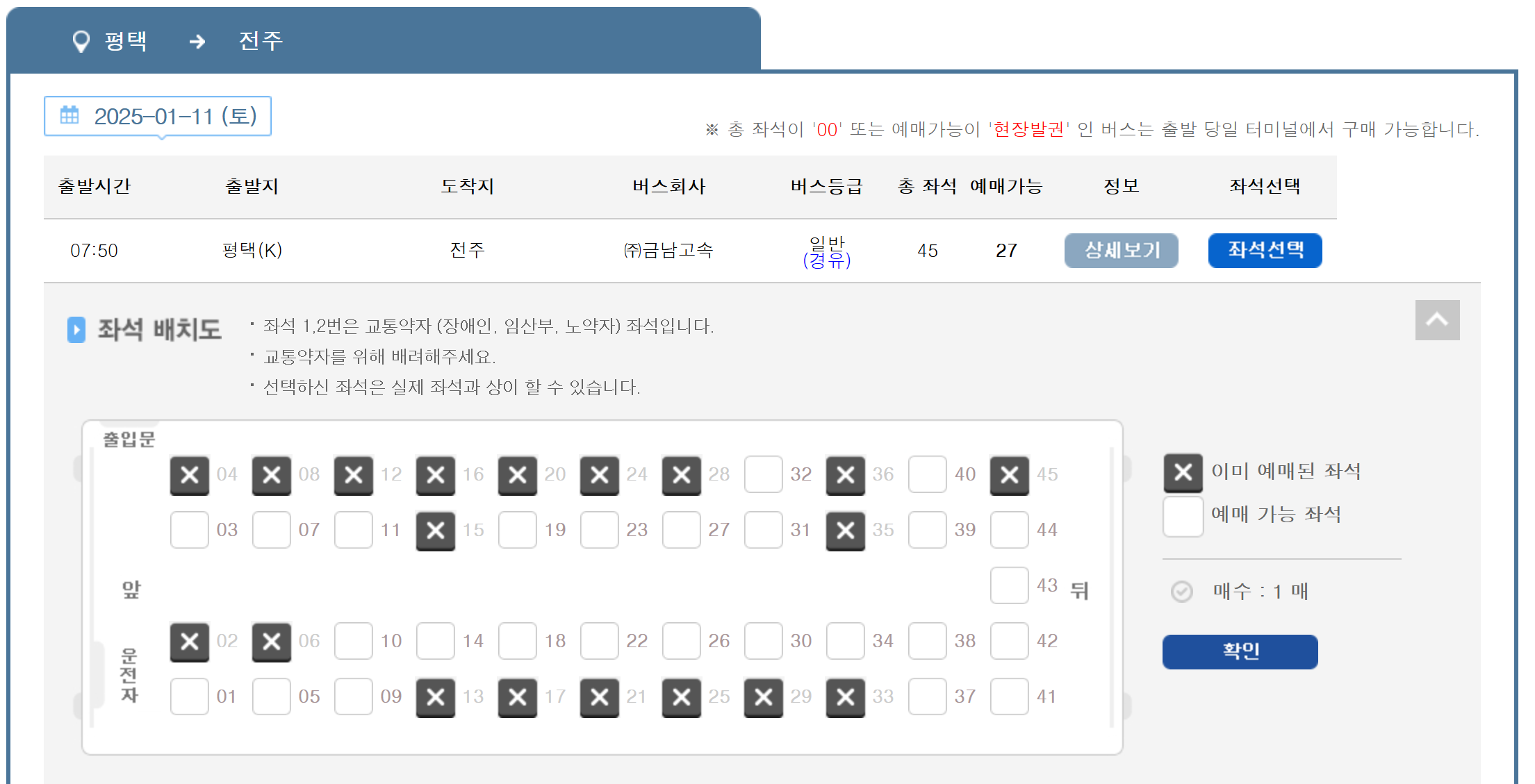 - 터미널 매표소에서 직접 예매 가능합니다.
