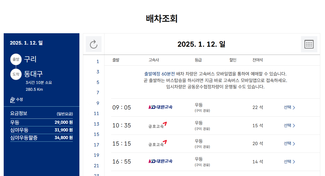 - 온라인 예매: 고속버스 통합 예매 플랫폼 코버스 또는 티머니고에서 간편하게 예약할 수 있습니다.
