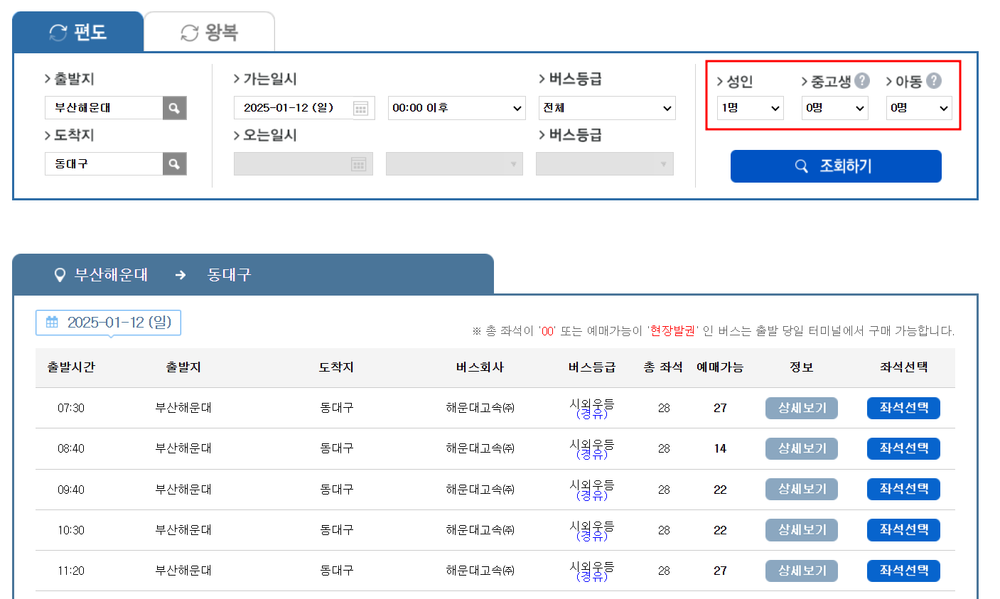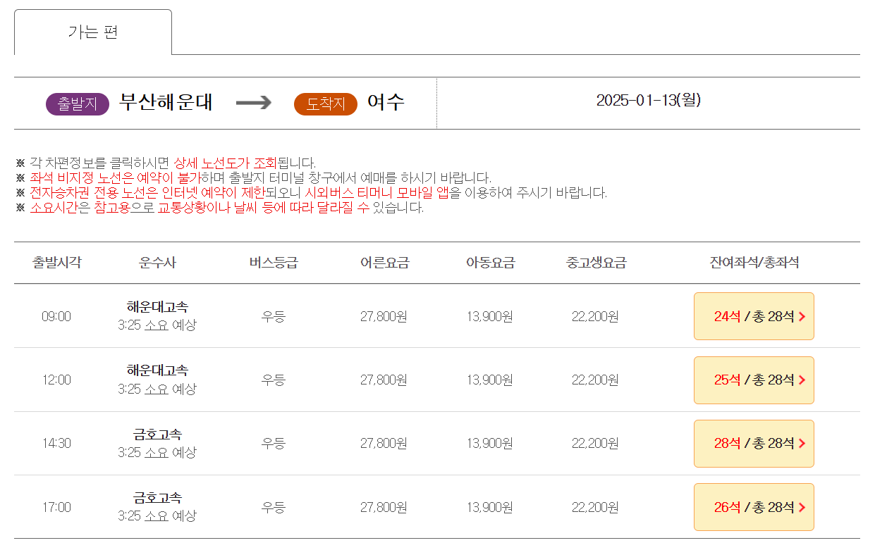 출발지와 목적지를 입력하고 원하는 날짜와 시간대의 버스를 검색하면 실시간 좌석 현황도 함께 확인할 수 있습니다.