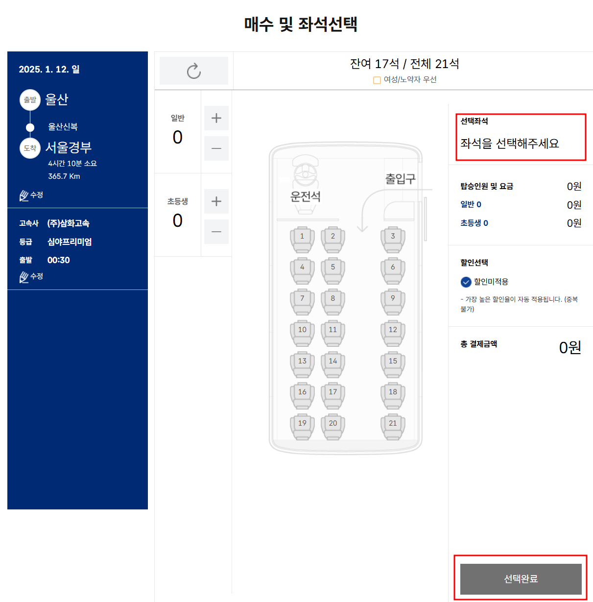 1️⃣ 원하는 시간의 버스를 선택하고, 탑승 인원과 좌석을 지정합니다.