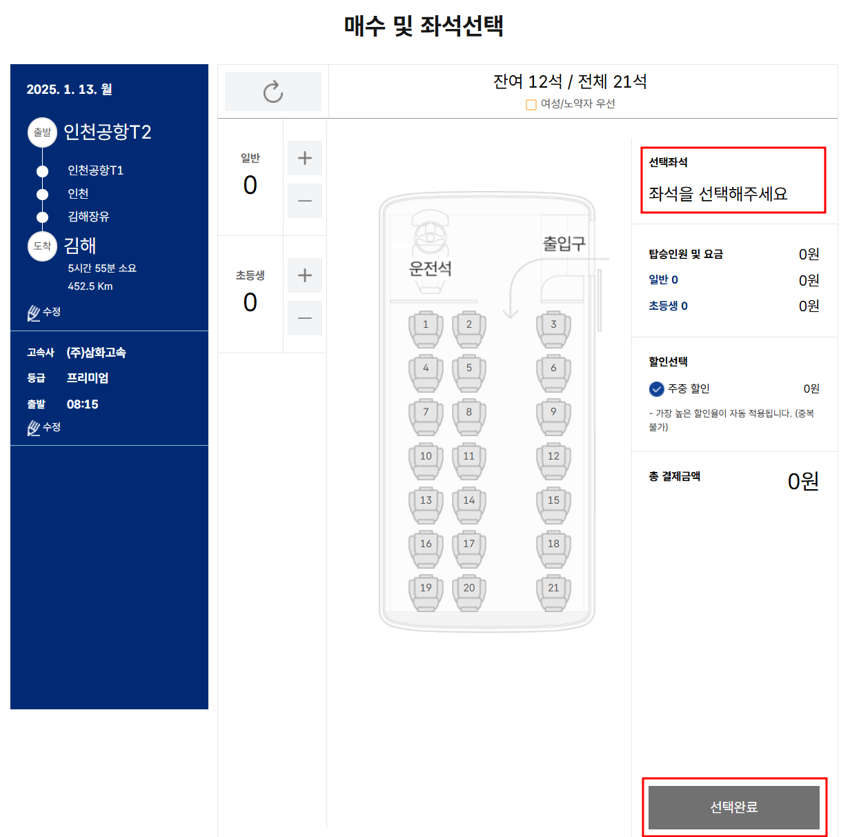 - 출발지와 목적지 입력 후 실시간 좌석 확인 가능.
