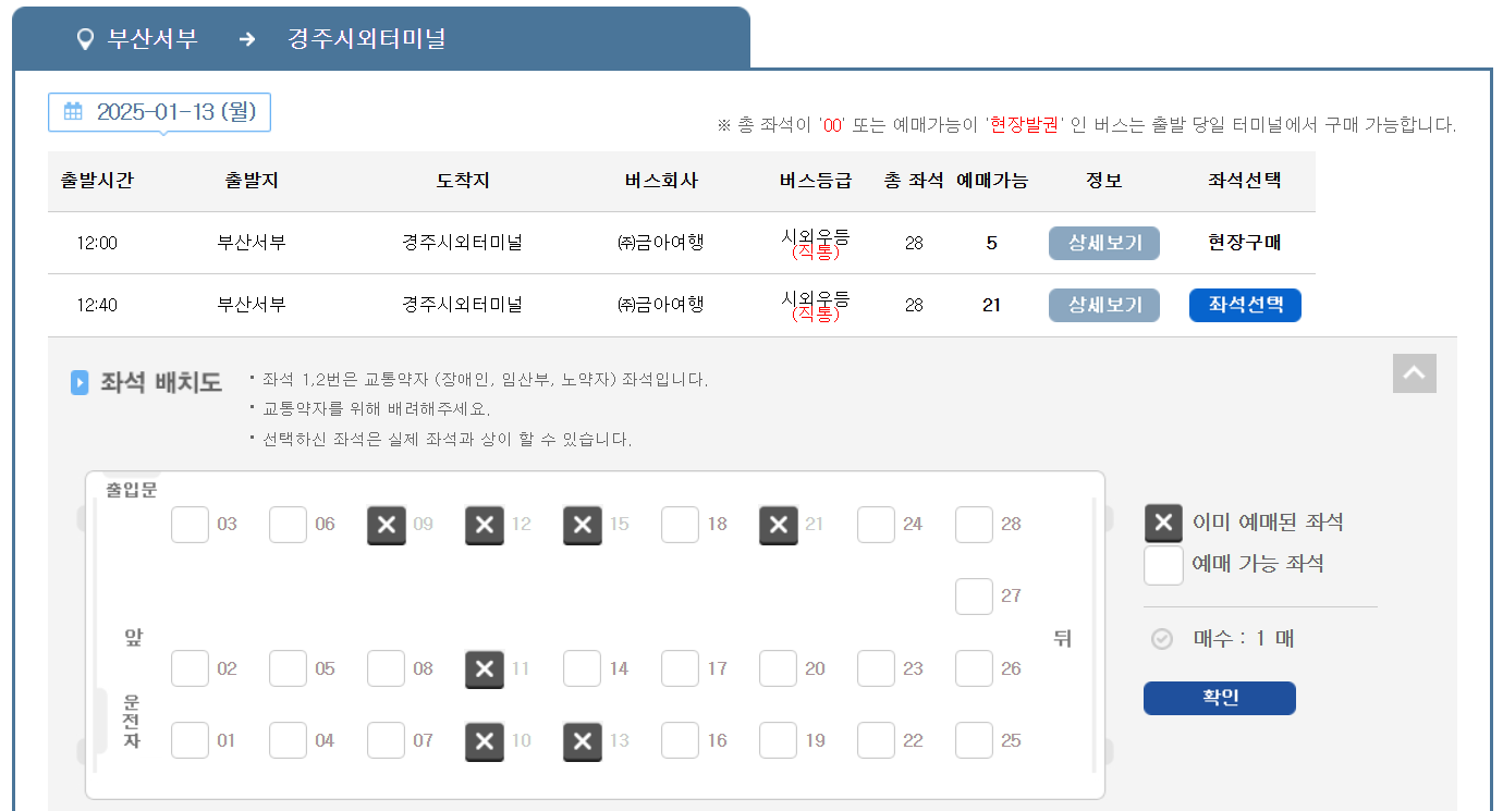- 원하는 버스 시간의 "좌석 선택" 버튼을 클릭해 좌석 배치도를 확인합니다.