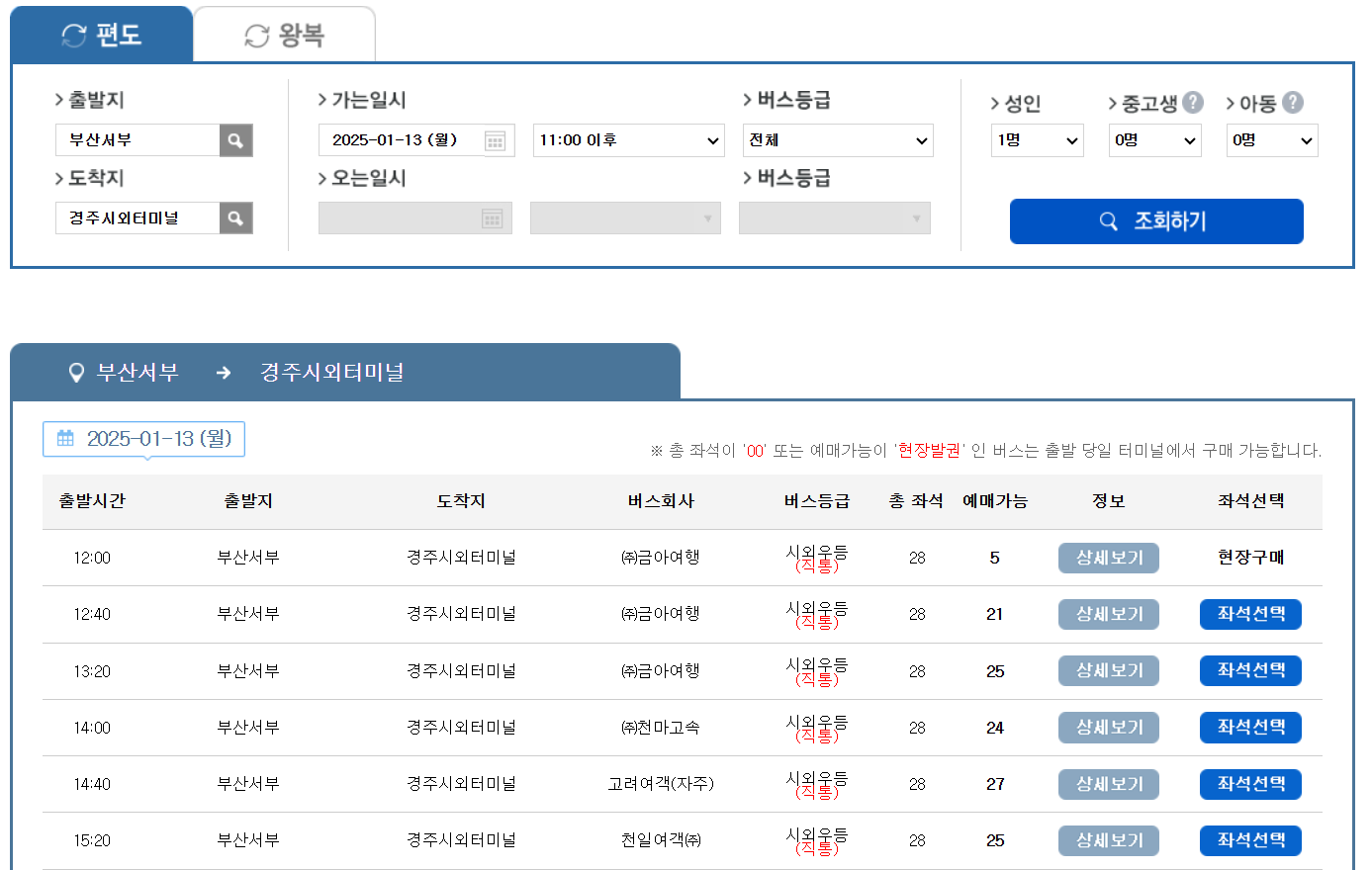 - 화면 상단의 출발지/도착지를 입력하고, 원하는 날짜와 시간을 설정한 뒤 조회 버튼을 클릭합니다.