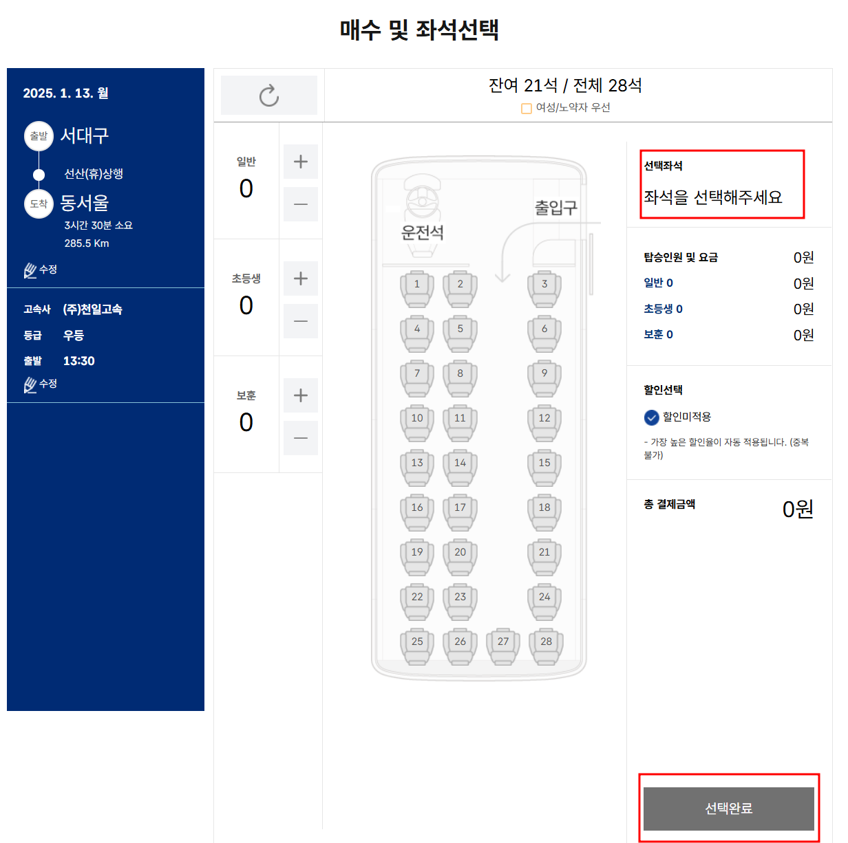 - 결과로 나타나는 시간표에서 원하는 노선을 선택하고 잔여 좌석 여부를 확인합니다.