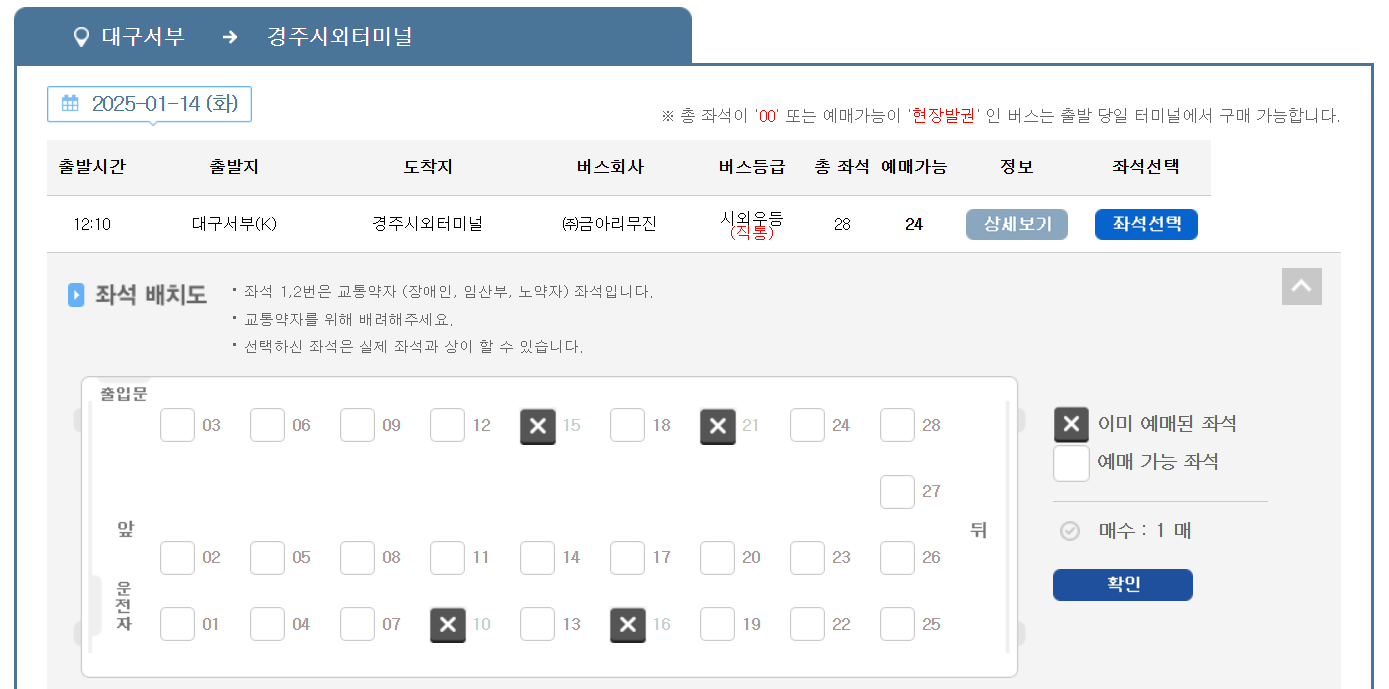 - 출발 시간과 남은 좌석을 확인 후 좌석을 선택합니다.