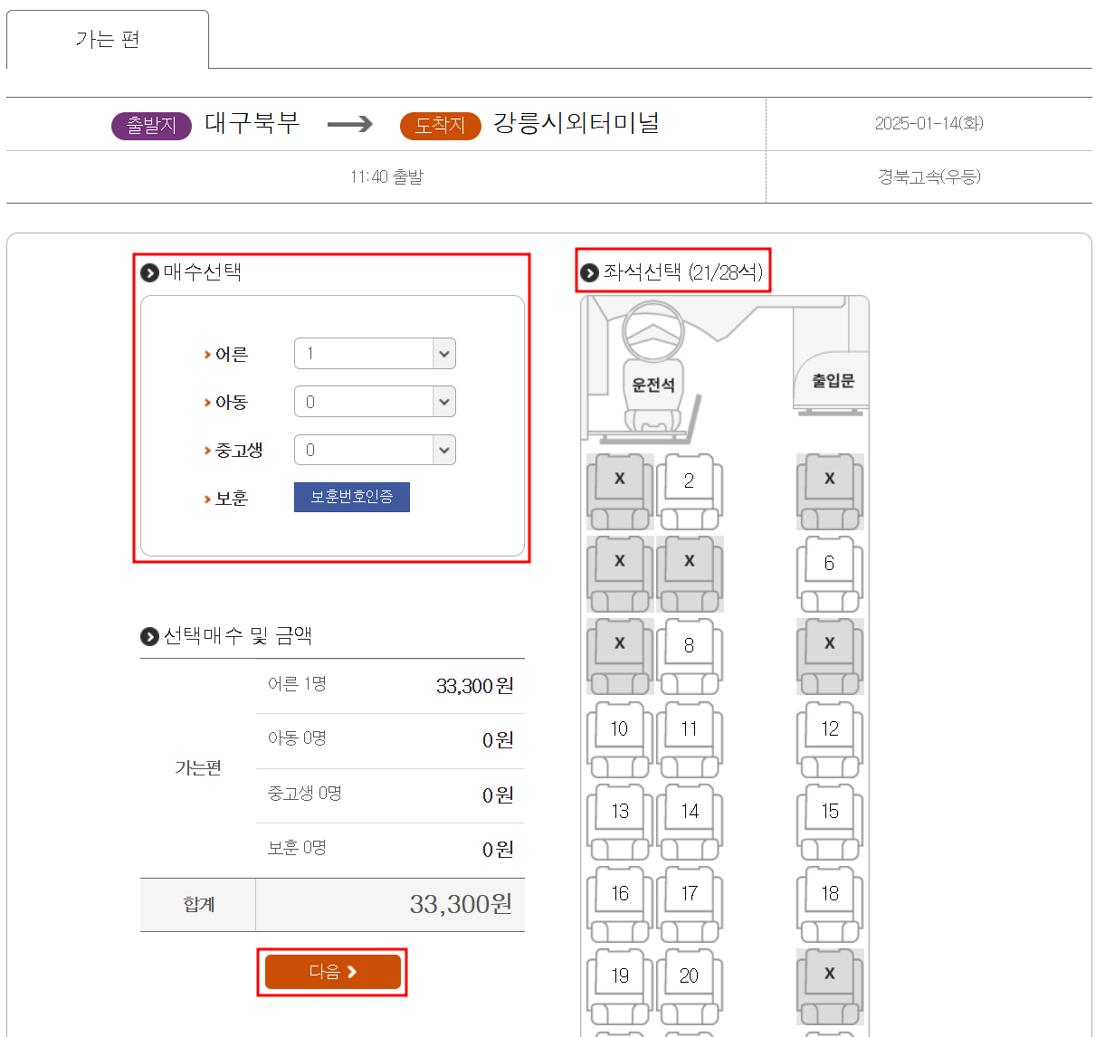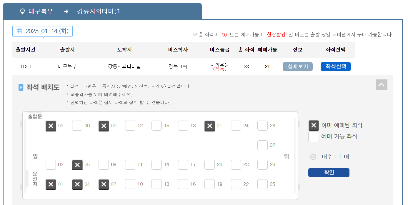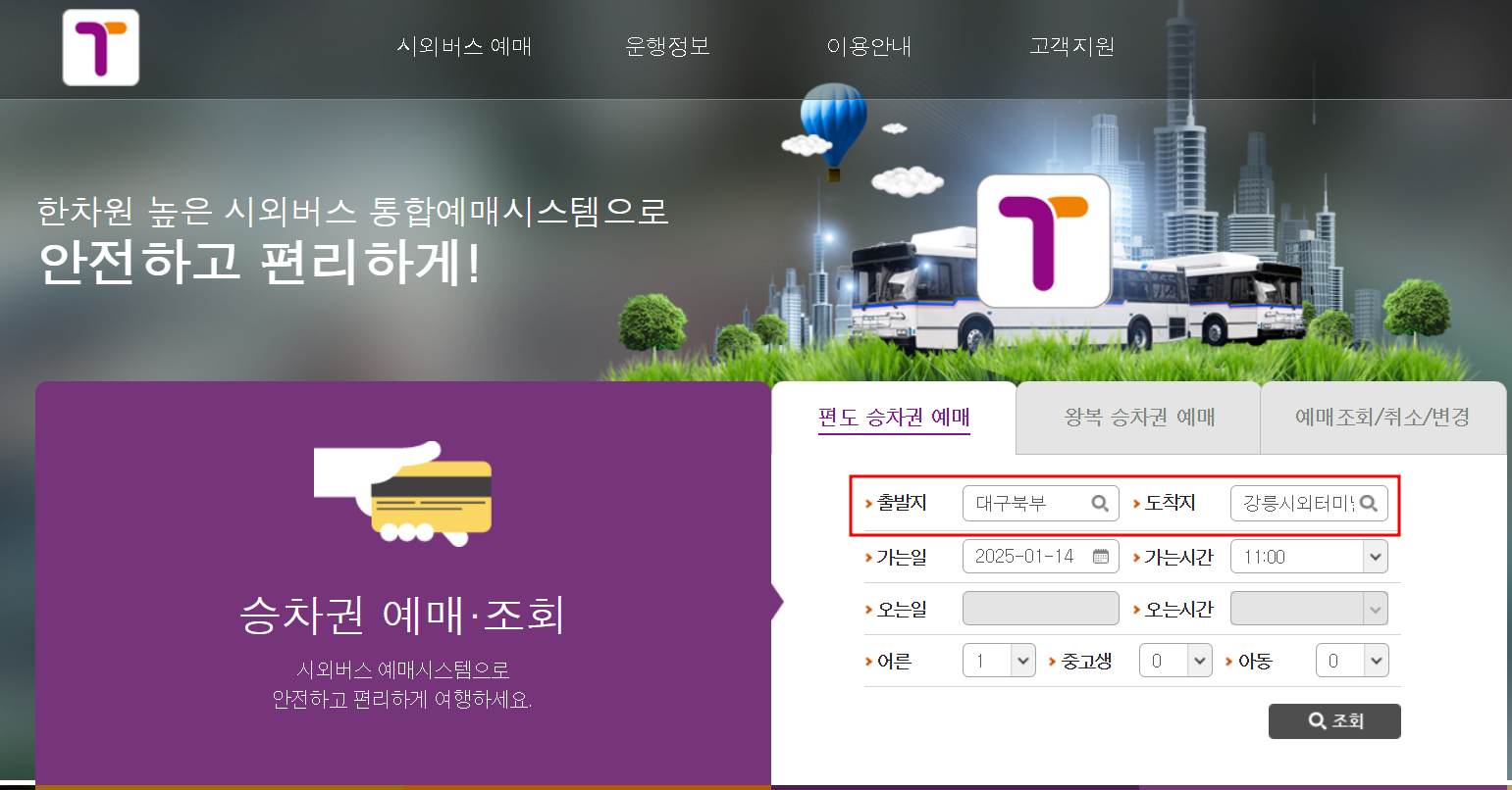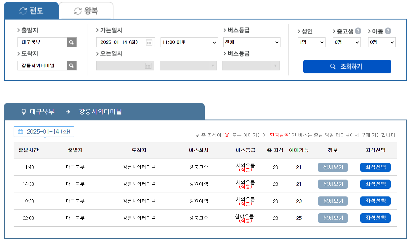 - 정보 입력: 출발지, 도착지, 출발일자를 입력한 후 조회된 시간표에서 원하는 버스를 선택합니다.