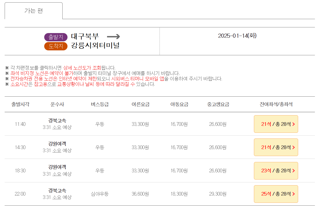 출발지와 도착지를 입력 후 원하는 날짜와 시간을 검색하면 실시간 좌석 정보까지 확인할 수 있습니다.