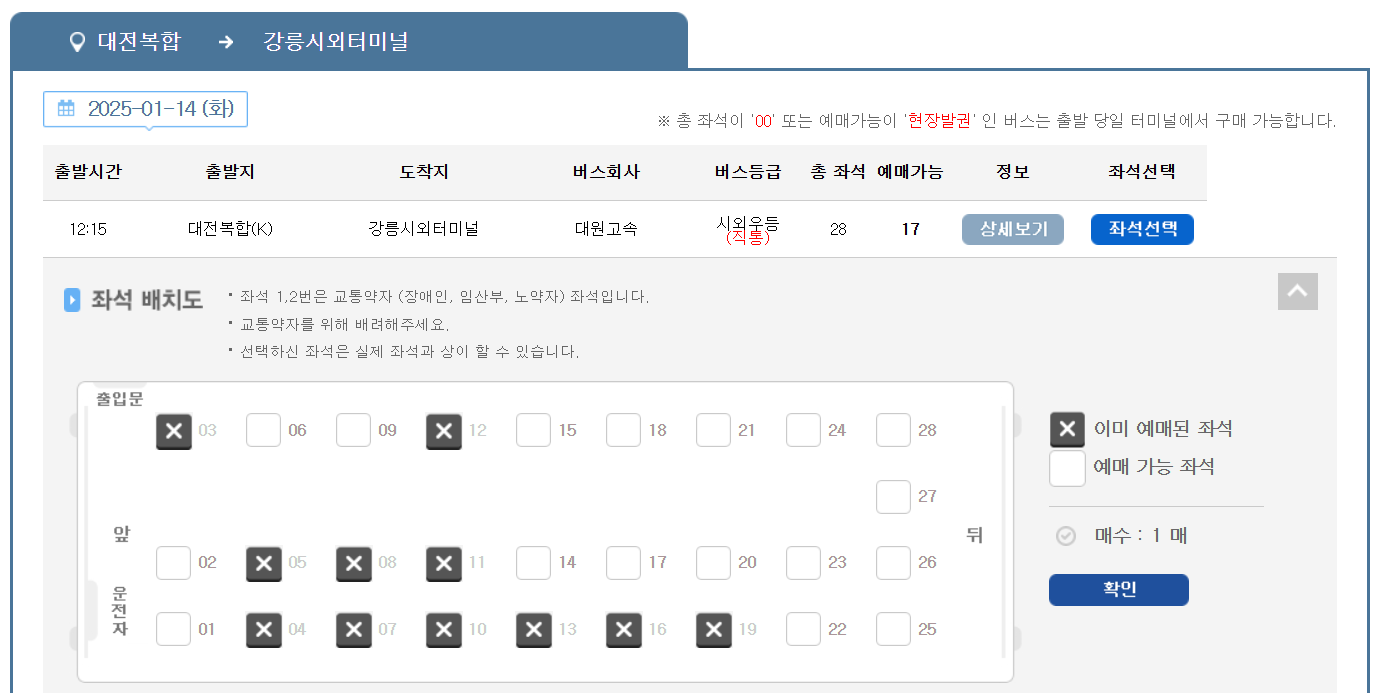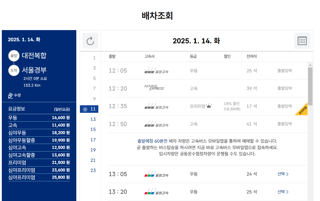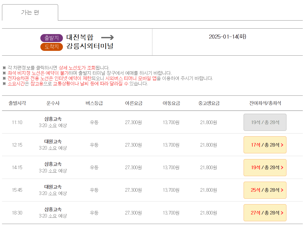 - 검색 방법: 출발지와 목적지를 입력 후 검색하면 해당 노선의 운행 시간과 잔여 좌석을 조회할 수 있습니다.