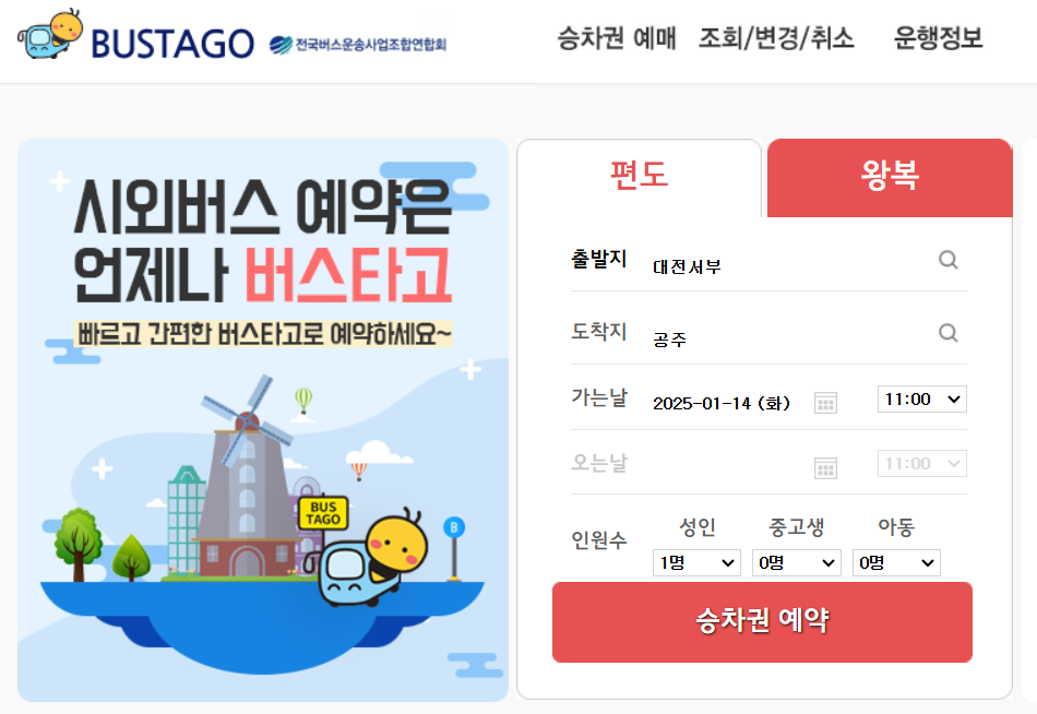 가는 날짜와 시간을 선택한 후, 승객 유형(어른, 청소년, 아동 등)과 인원을 설정합니다.