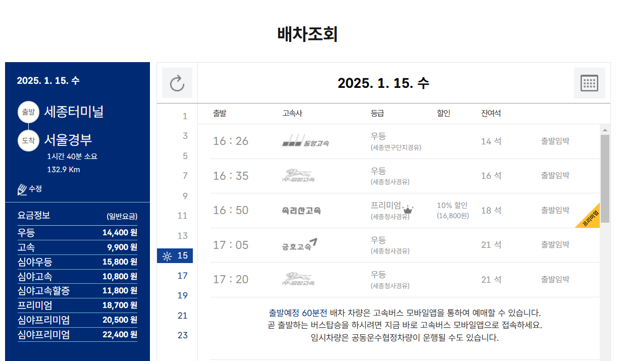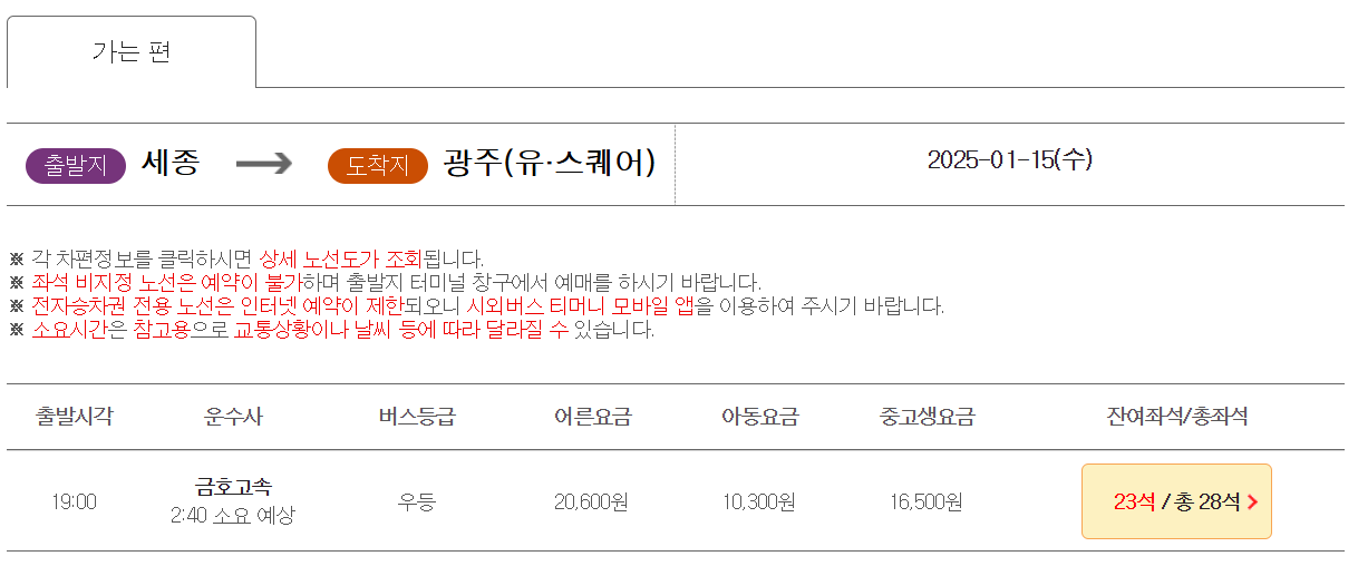 - 조회 결과에서 출발 시간, 잔여 좌석, 요금, 소요 시간을 확인하세요.