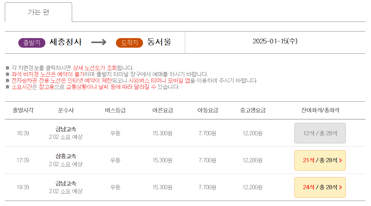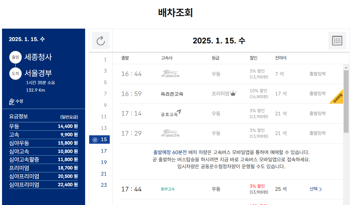 - 정보를 입력한 후 "조회" 버튼을 누르면 해당 날짜의 시간표와 요금을 확인할 수 있습니다.