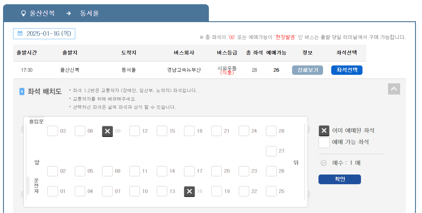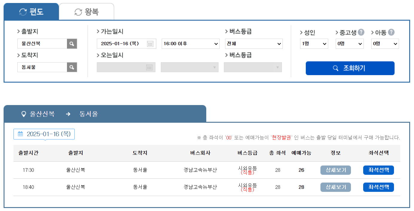 고속버스터미널 공식 웹사이트에서 시간표와 함께 실시간 좌석 현황을 조회할 수 있습니다.