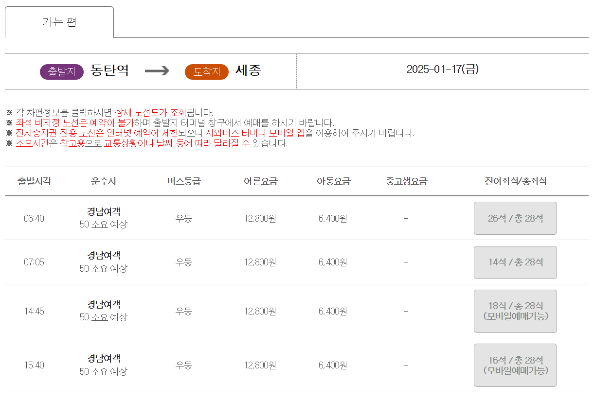 공식 웹사이트 고속버스 티머니를 통해 출발지와 목적지, 날짜를 입력하면 실시간 좌석 현황까지 확인 가능합니다. - 시외버스 시간표 조회