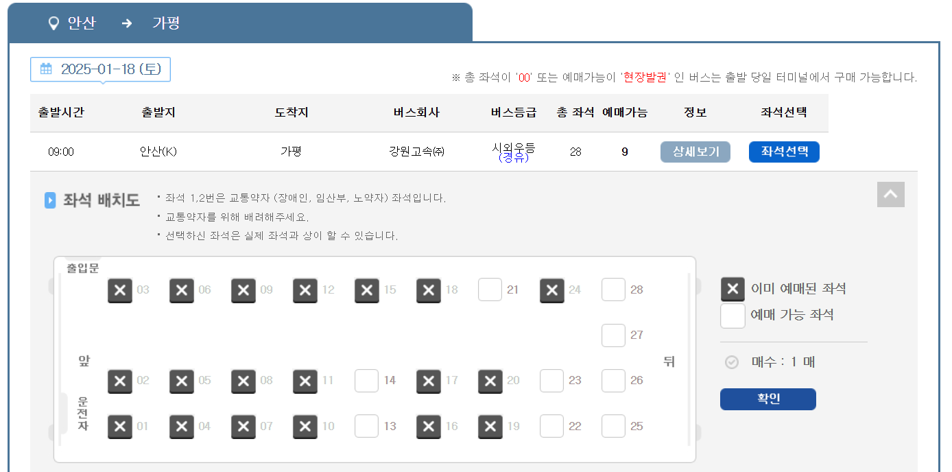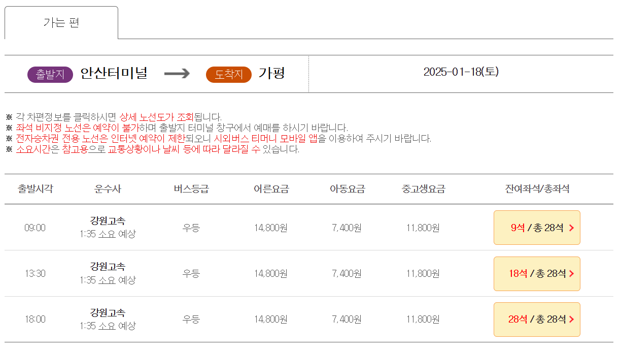 이들 웹사이트에서 출발지, 목적지, 날짜를 입력하면 운행 시간표와 실시간 좌석 현황을 확인할 수 있습니다.