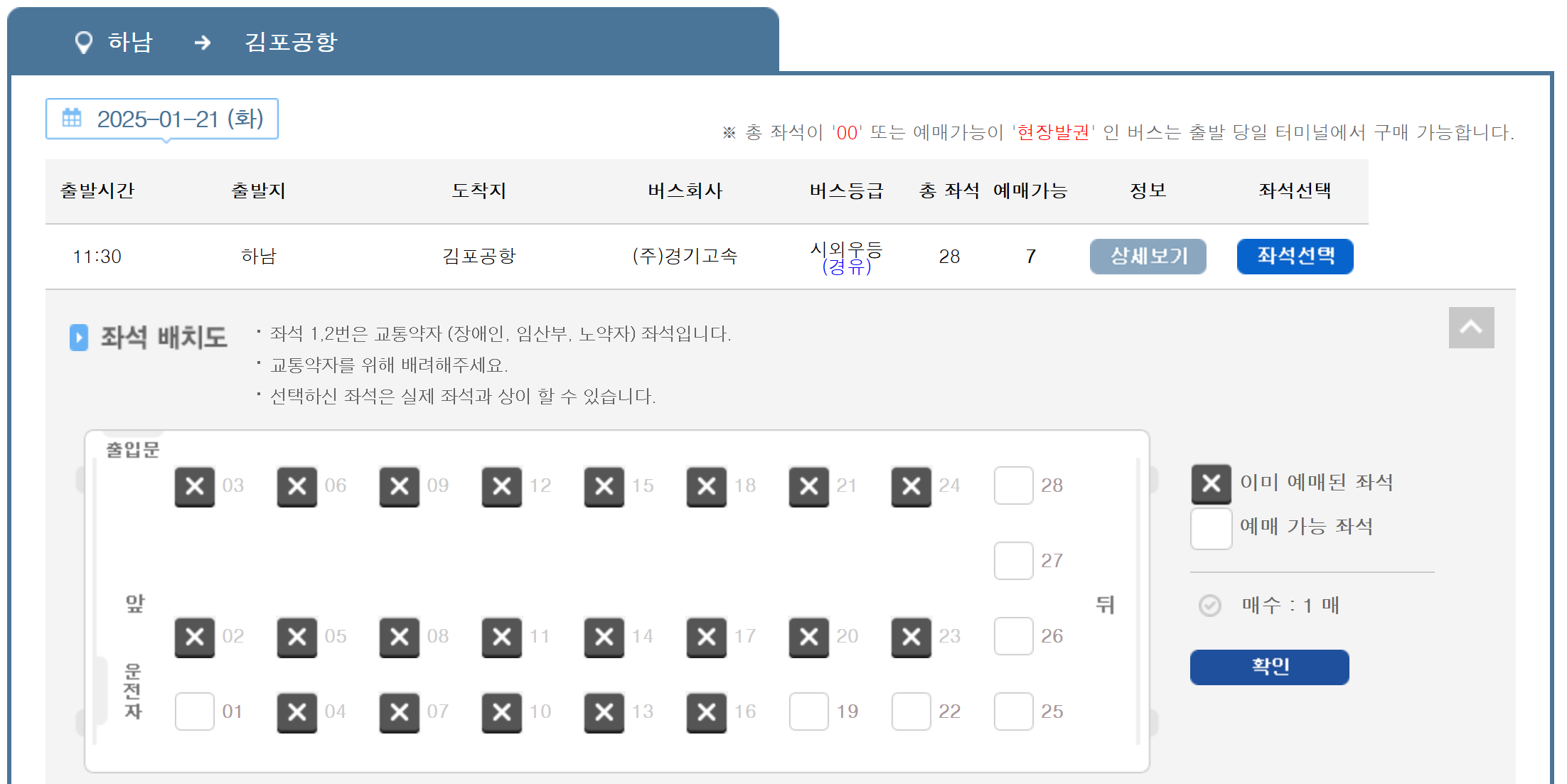출발지와 도착지를 입력한 뒤 원하는 시간대와 날짜를 선택하여 실시간 좌석 정보를 확인할 수 있습니다.