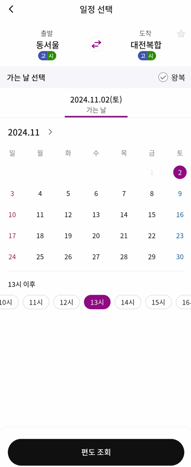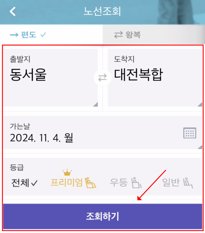 5️⃣ 모든 정보를 선택 후 편도 조회 버튼을 눌러 줍니다.