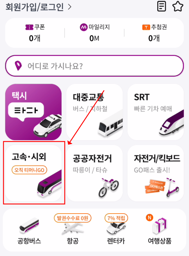 2️⃣ 어플로 접속시 고속/시외 버튼을 선택합니다.