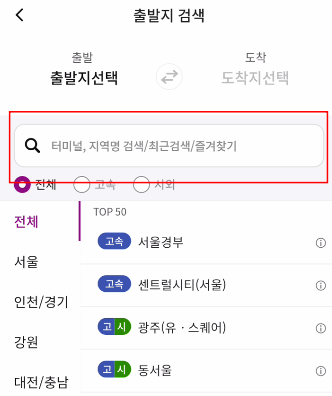 3️⃣ 터미널명 혹은 지역명을 입력 후 검색을 합니다.
